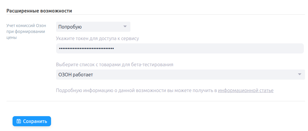 Поддержка работы с данным сервисом обеспечивается плагином "Ozon: Интеграция" начиная с версии 2025.7.0. После установки плагина (или обновления) необходимо перейти в раздел Магазин - Плагины - Ozon: Интеграция, и на вкладке Системные настройки в разделе Расширенные возможности, включить опцию Учет комиссий Озон при формировании цены, выбрать список товаров, для которых будет учитываться комиссия в цене, и указать токен доступа.