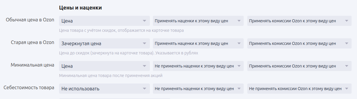 На вкладке Цены и остатки надо указать для каких типов цен, передаваемых в Озон, необходимо учитывать размер комиссии.