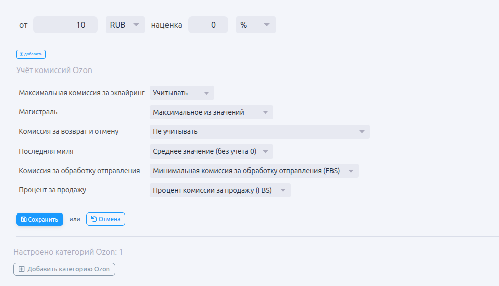 После этого можно переходить к непосредственно настройкам учета комиссий. Сделать это можно на вкладке Категории в этом же разделе. Непосредственно интерфейс настройки учета комиссий расположен в том же блоке, где и Наценки категорий. Можно задать настройки учета комиссий как для всех категорий Озон, так и для каждой индивидуально.