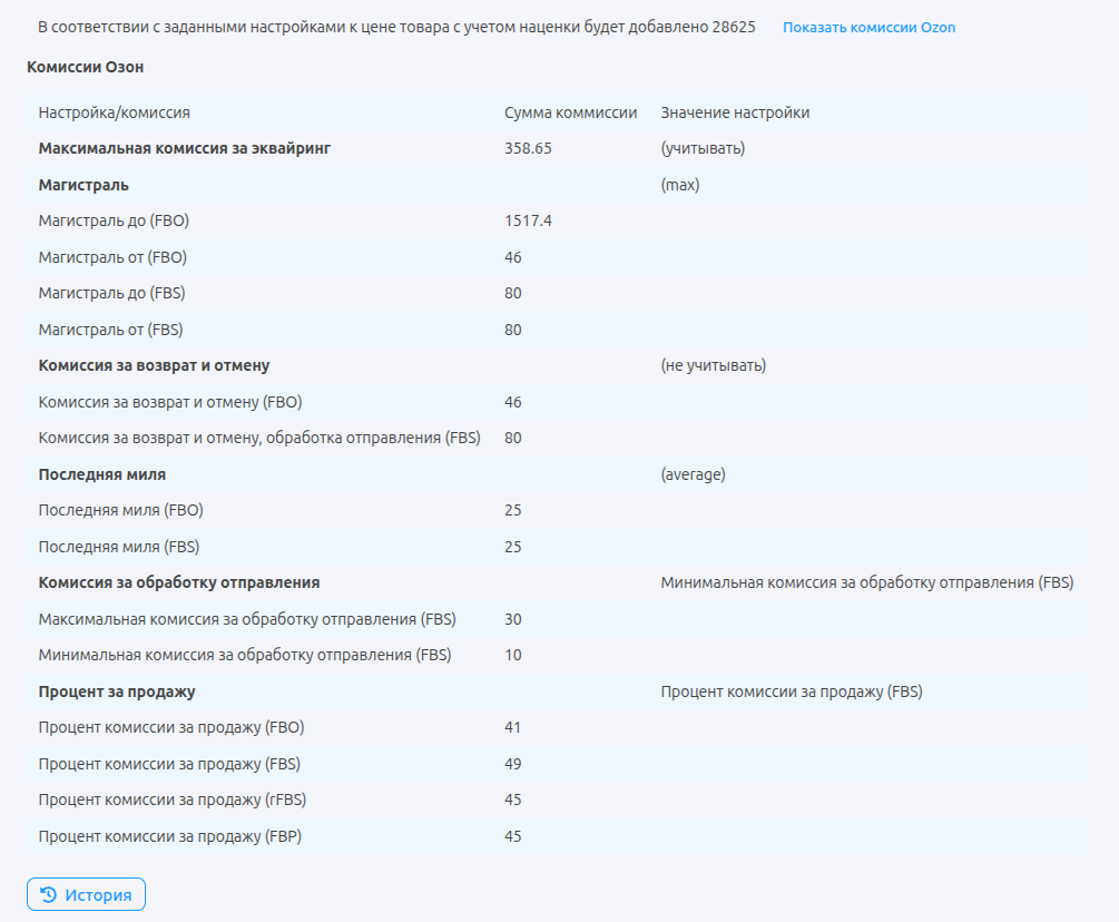 В этом блоке подробно расписаны комиссии Озон для каждой из схем работы. Соответственно, сумма добавляемая к цене товара основывается на этих цифрах и настройках, сделанных на предыдущем этапе. Кроме непосредственно размера комиссий, есть возможность посмотреть историю изменения цены товара, которую плагин передавал в Озон.
